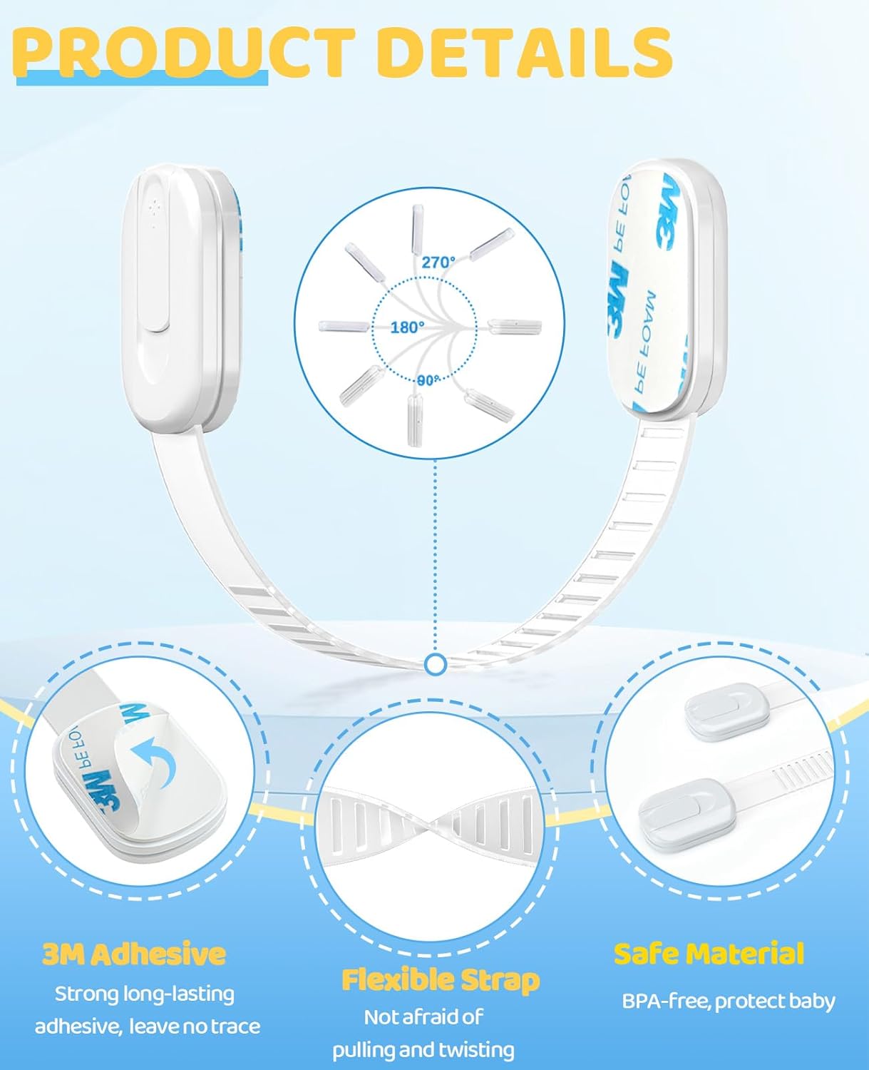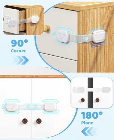 - Baby-safe Materials: The cabinet locks are made from carefully selected BPA-free materials, ensuring no hazards when your baby comes into contact with it. The strap features a tear-resistant design, withstanding prolonged pulling by your baby without tearing or deforming