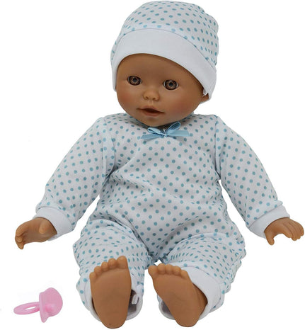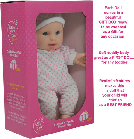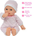 • FREE DOLL PACIFIER INCLUDED - Caucasian Soft Baby Doll with Amazingly Detailed Vinyl Head, Arms, and Legs. This BABY DOLL comes Dressed in a Polka Dotted Onesie and a Sweet matching Hat