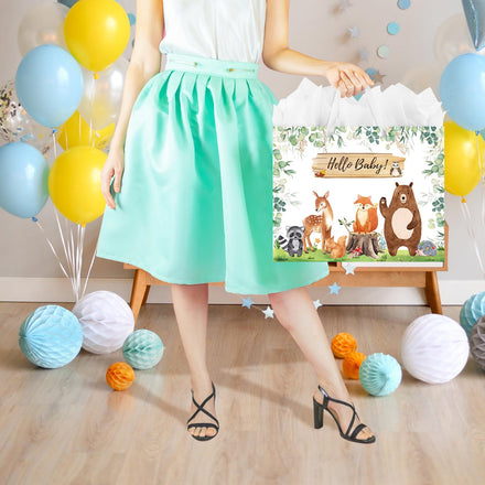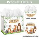 13" Large Baby Boy Girl Gift Bag for Baby Shower or Birthday with Handle, Tissue Paper and Greeting Card (Woodland Animals Sage Green Design)