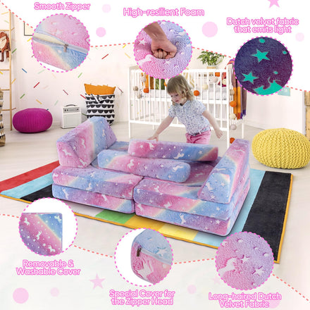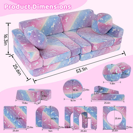 - 13 Piece Kids Sofa: The toddler couch features 6 basic cushion part, 2 armrest parts, 2 trapezoid pillows, 2 pumpkin shape cushion parts, 1 round cushion parts. The toddler couch is not only a comfortable sofa, but also can meet various needs for playing, climbing, chatting, watching TV or just relaxing.