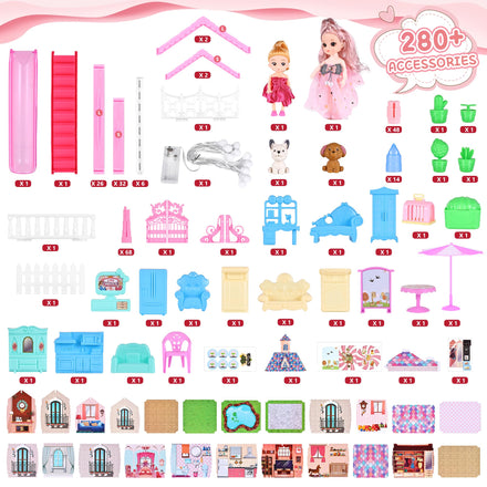 • 【280+ Accessories for Endless Fun】Includes over 280 colorful furniture pieces and accessories, such as beds, sofas, kitchen appliances, a dining set, and even adorable pets with their own mini house. Every piece is movable, allowing kids to design and redecorate their dream home however they like.