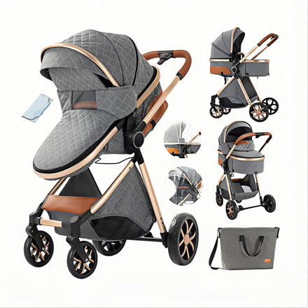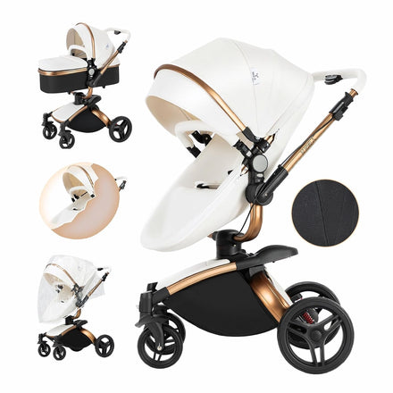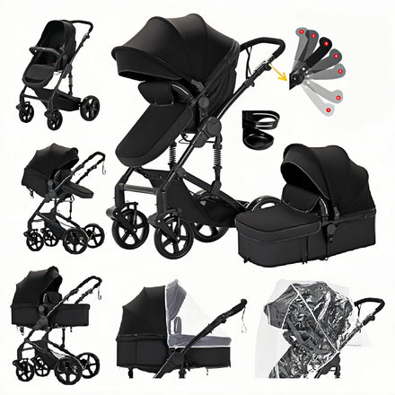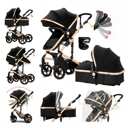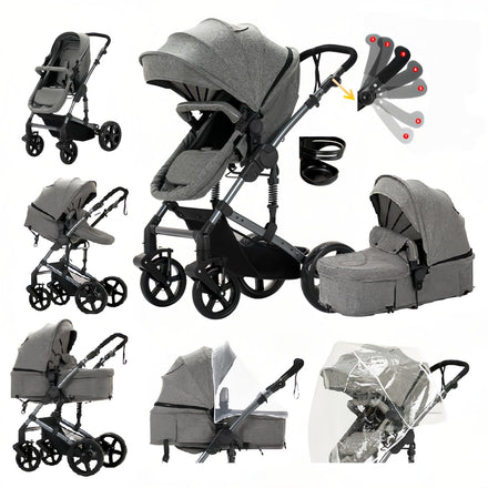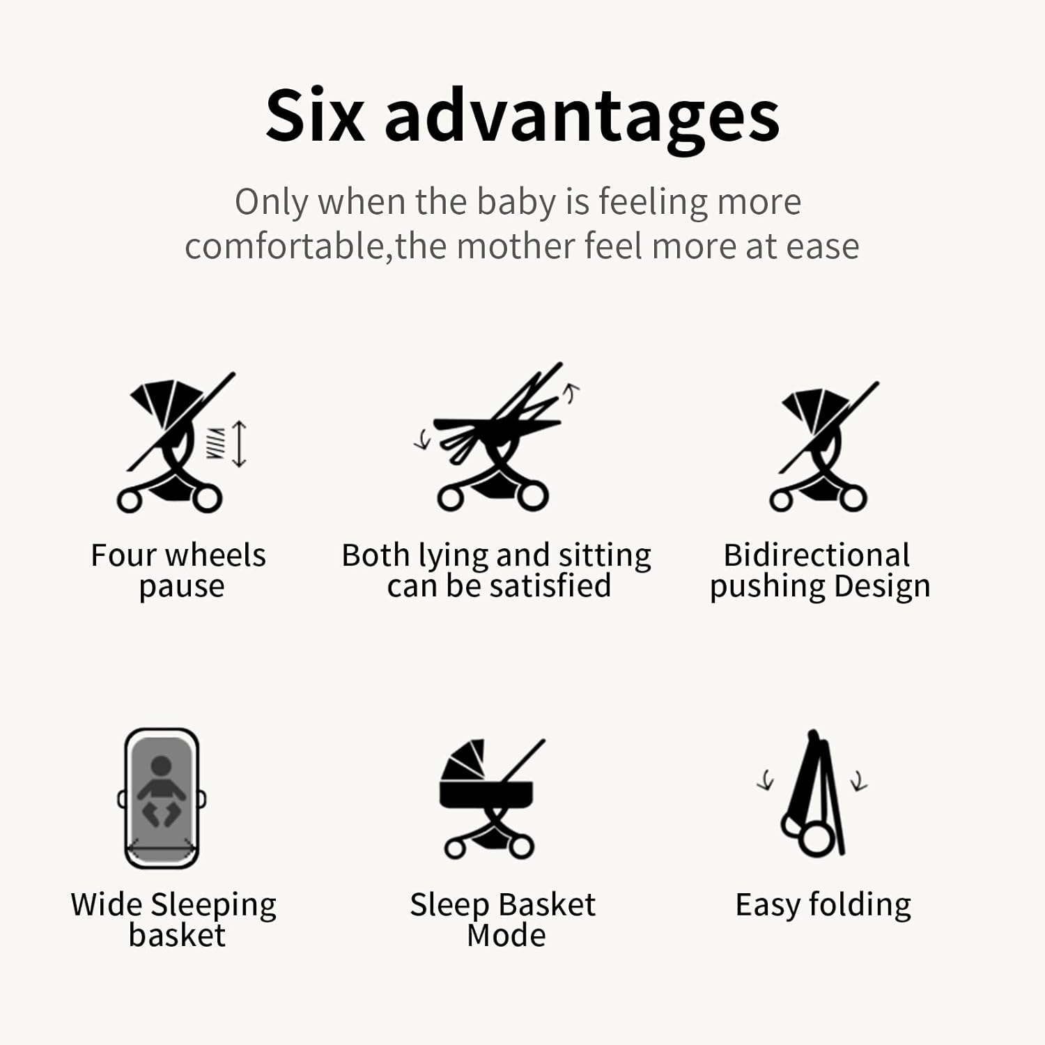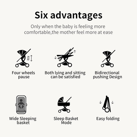 Folds up quickly with one click for easy storage. Multi-speed backrest adjustment, easy to sit or lie down. Equipped with mosquito nets and mackintoshes, so that the baby can travel with peace of mind. Removable armrest design allows mum to pick up baby easily Pushchair rear mummy bag design, convenient for mummy storage Easily switch from pushchair to sleeping basket, the sleeping basket is large enough to give your baby plenty of room to move around. Folds very easily, compact when folded, easy to store Use the foot brake, easy and convenient, a brake to stop, to protect safety Large capacity storage bag underneath, easy to store baby's various baby products Five-point harness keeps baby safe Height adjustable, can also be used as a dining table and chairs, easy to match most of the dining tables on the market Breathable visual mesh for mum to keep an eye on her baby at all times Two-way pushchair design makes it easy for mum to change direction The fabric is soft and comfortable, removable for hand washing or machine washing, dirt and wear resistant Attached foot cover, windproof and warm, so that the baby can fully feel the warmth even in the outdoors