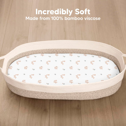 2-Pack Baby Bassinet Sheets Girl, Boy - 33x17 Viscose Derived from Bamboo Bedside Mattress Fitted Bassinet Sheets, Compatible with Halo Bassinest Swivel Sleeper, Baby Delight, Graco(Nibbles/Bruce)