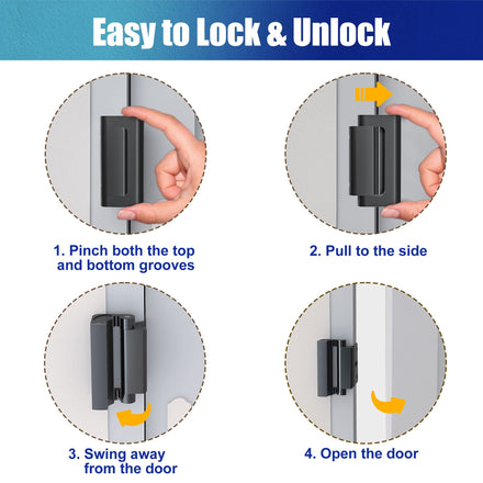 • Easy to Use: Use your thumb and forefinger to pinch both the top and bottom grooves, pull to the side and swing away from the door to open the lock. Reverse the actions to close. You can also see a step-by-step instruction in our pictures