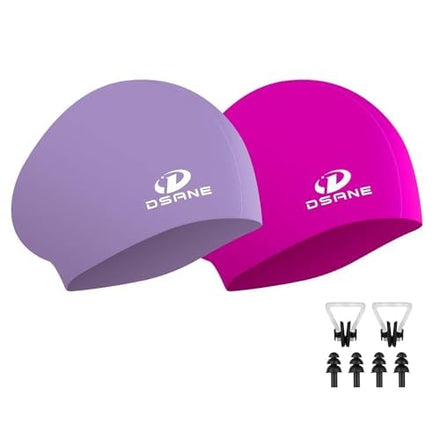 2 Pack Womens Silicone Swim Cap for Long Hair,3D Ergonomic Design Silicone Swimming Caps for Women Kids Men Adults Boys Girls with Ear Plug and Nose Clip(M)