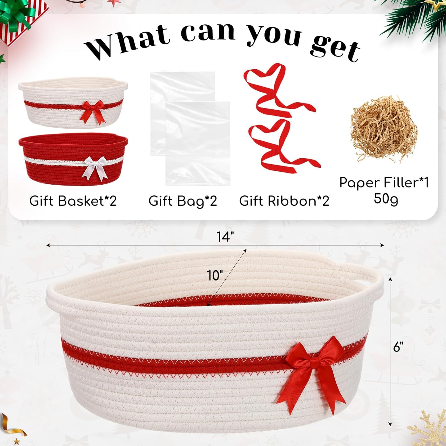 2 Packs Small Woven Basket with Bow and Handle 14 x 10 x 5.5 Inches Gift Basket with Raffia Paper Fill for Christmas Wedding Nursery Birthday Baby Shower Party Favor (Red and White)