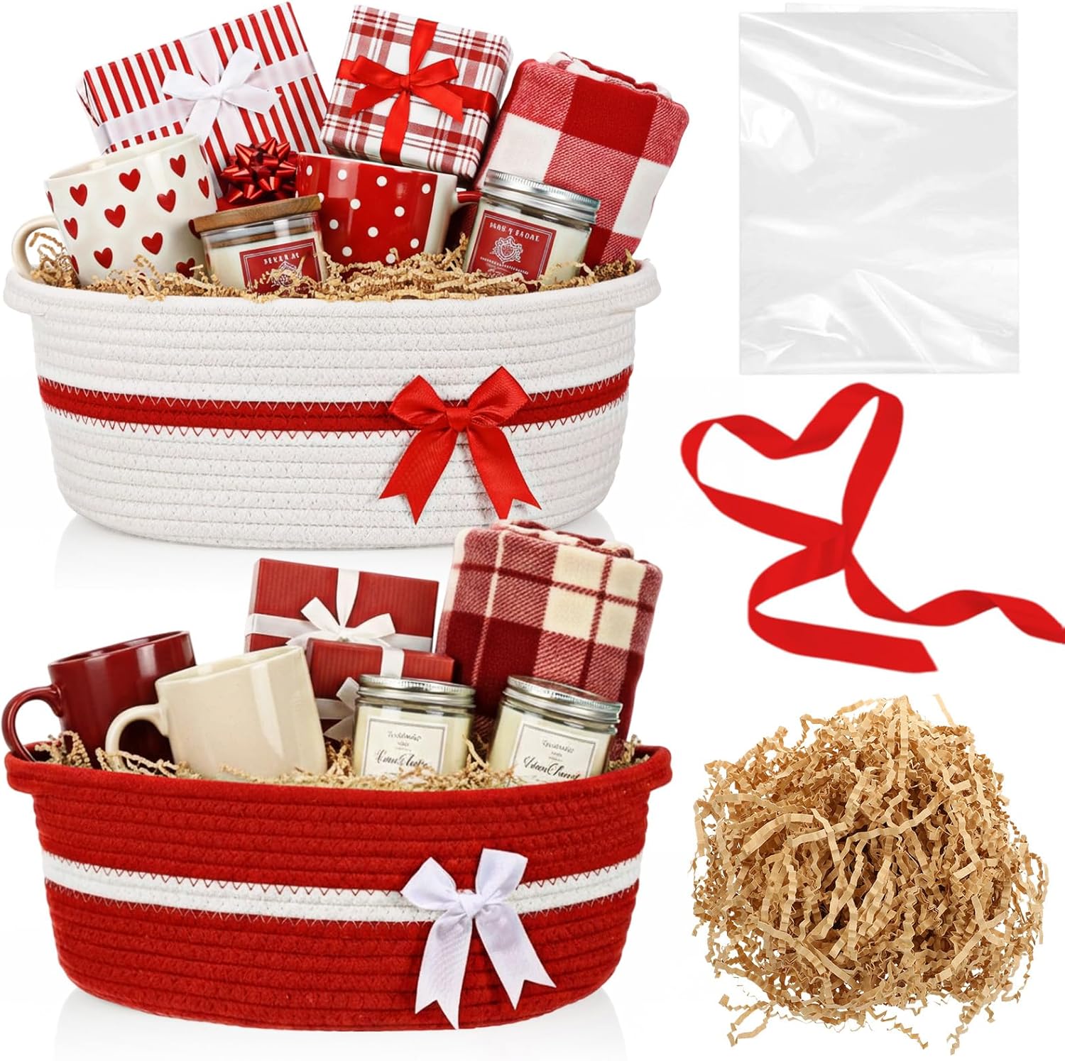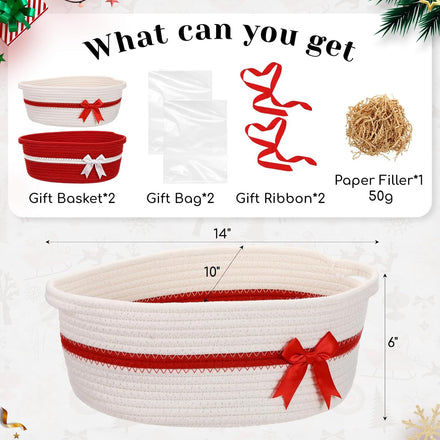 Features: This small woven basket with bow features sturdy handles on both sides for easy carrying. It can be used as a gift basket for housewarmings, baby showers, Mother's Day, Thanksgiving, and Christmas. These small woven rope gift baskets are collapsible. Once you've filled them with towels or blankets, they'll quickly return to their original shape. Ironing them is a good idea, too. When not in use, you can fold them flat for easy storage. Specifications: Material: woven Color: red and khaki Size: about 14 x 10 x 5.5 inches/ 35.5 x 25.5 x 14.0 cm Package includes: 2 x Woven baskets 2 x Gift bags 2 x Ribbons 50G raffia paper fill Notes: Manual measurement, please allow slight errors on size. The color may exist a slight difference due to different screen displays