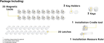 - [ 20 LOCKS + 2 KEYS ] Baby Child Safety Magnetic Cabinet Locks Work Both for Drawers and Cabinets. Improved Locks Extra Stronger Magnetic enough to keep a house cat or toddles out.Child Proofing Locks with Magnet key control. 3M Adhesive for Cabinets & Drawers - No Tools, No drill, No holes