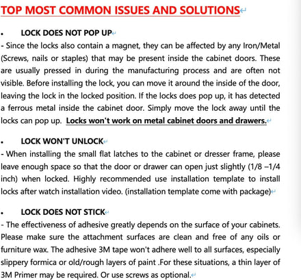 - [ INSTALLATION TIPS] The locks can be affected by any Iron/Metal (Screws, nails or staples) that may be present inside the cabinet doors, and not visible. Before installing the lock with the adhesive, move it around the inside of the door, leaving the lock in the locked position. If the locks does not pop up, it has detected a ferrous metal inside the cabinet door. Simply move the lock away until the locks can pop up, and install the lock in that position.