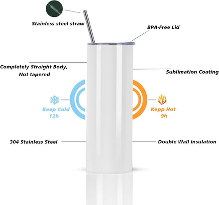 • DOUBLE WALL INSULATION: Made of 304 stainless steel and with double wall vacuum insulation, this blank sublimation tumblers 20 oz skinny straight keeps your drink cold for 12 hours and hot for 9 hours.
