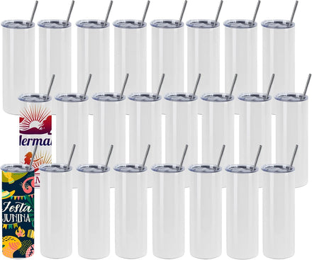 24 Pack Sublimation Tumblers Bulk 20 oz Skinny Straight, Sublimation Blanks Double Wall Stainless Steel Skinny Tumbler with Lid and Straw, Shrink Wrap Film, Individually Boxed, for Heat Press Machine