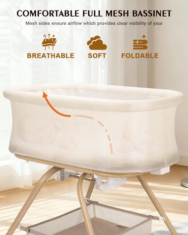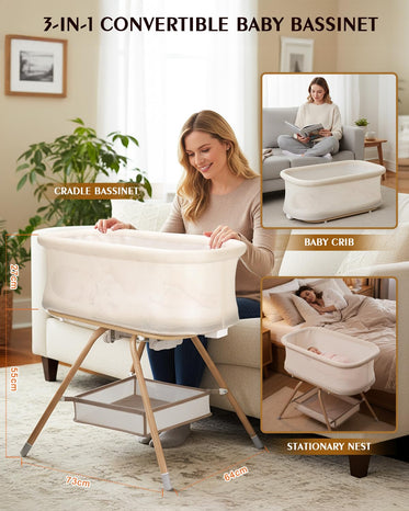 3 in 1 Baby Bassinet, Rocking Bedside Bassinet for Baby with Mesh Design & Soft Mattress, Bassinet Bedside Sleeper for Newborn Infant,Portable Nest with Storage Basket, Easy Assemble & Folding Beige