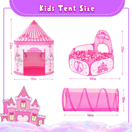 • ๐Ÿ’—3 in 1 Pop up Kid Tent: The 3Pcs girls toy tent is combined with a kids ball pit, a crawling tunnel, and a castle tent. Each play house tent can be used together or separately easily. This Combination of toddler tents can exercise kid's hands-on and crawling ability, and inspire intelligence. Throwing the balls into the basket hoop encourages kids physical play and stimulates their imaginations at any time.