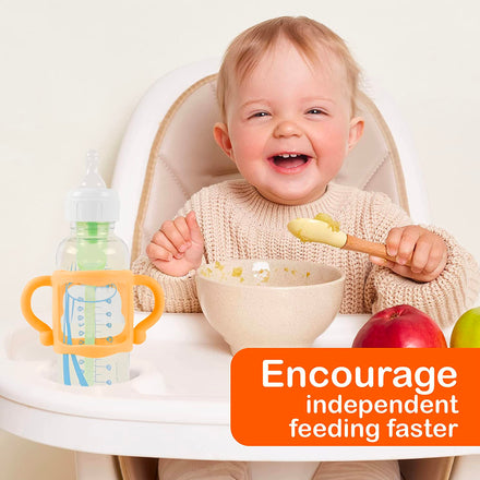• DUAL EASY-GRIP HANDLES - Encourage independent feeding faster and more effectively with 2 easy-grip handles. Unlike other baby bottle holders, the handles are smoother, longer, and more ergonomic for a more natural grip
