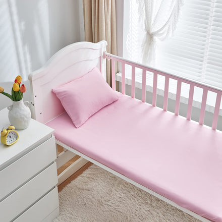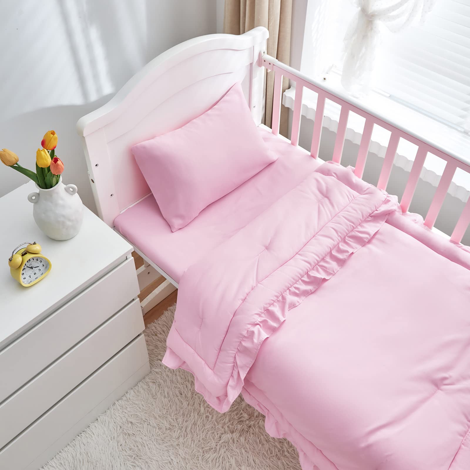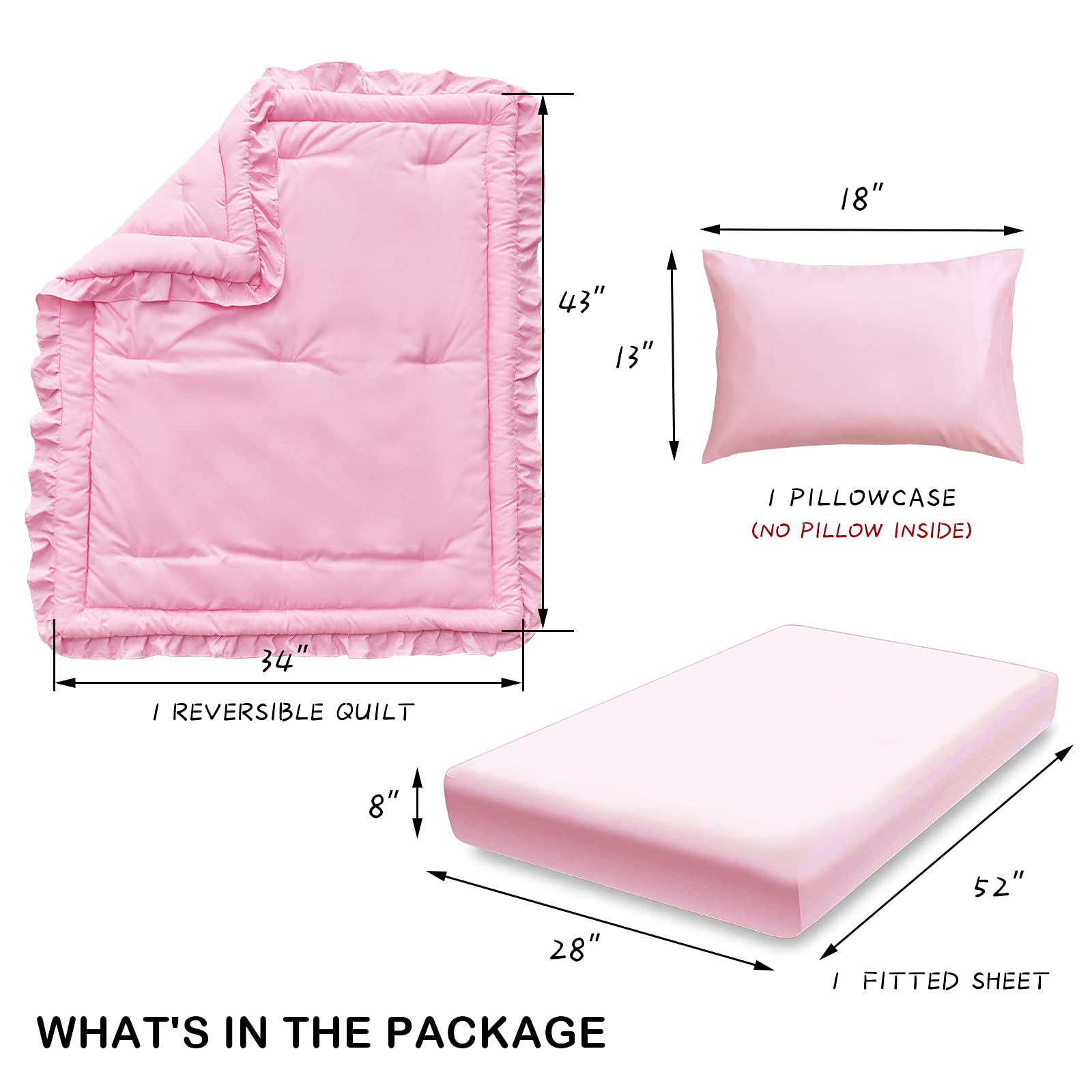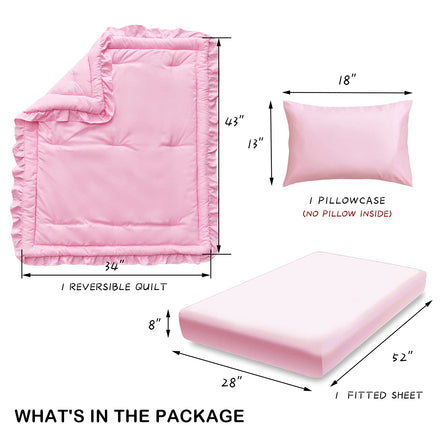 • [ Package ]: 1 Quilted Comforter 34"x 43" with 2 inch Ruffle ; 1 Fitted sheet 28"x52"+ 8" fits a standard size crib mattress : The pillowcase is 13"x18" for standard toddler pillow, The 3 pc crib set will fits most crib bedding. Try a new cute ruffle design for your baby.