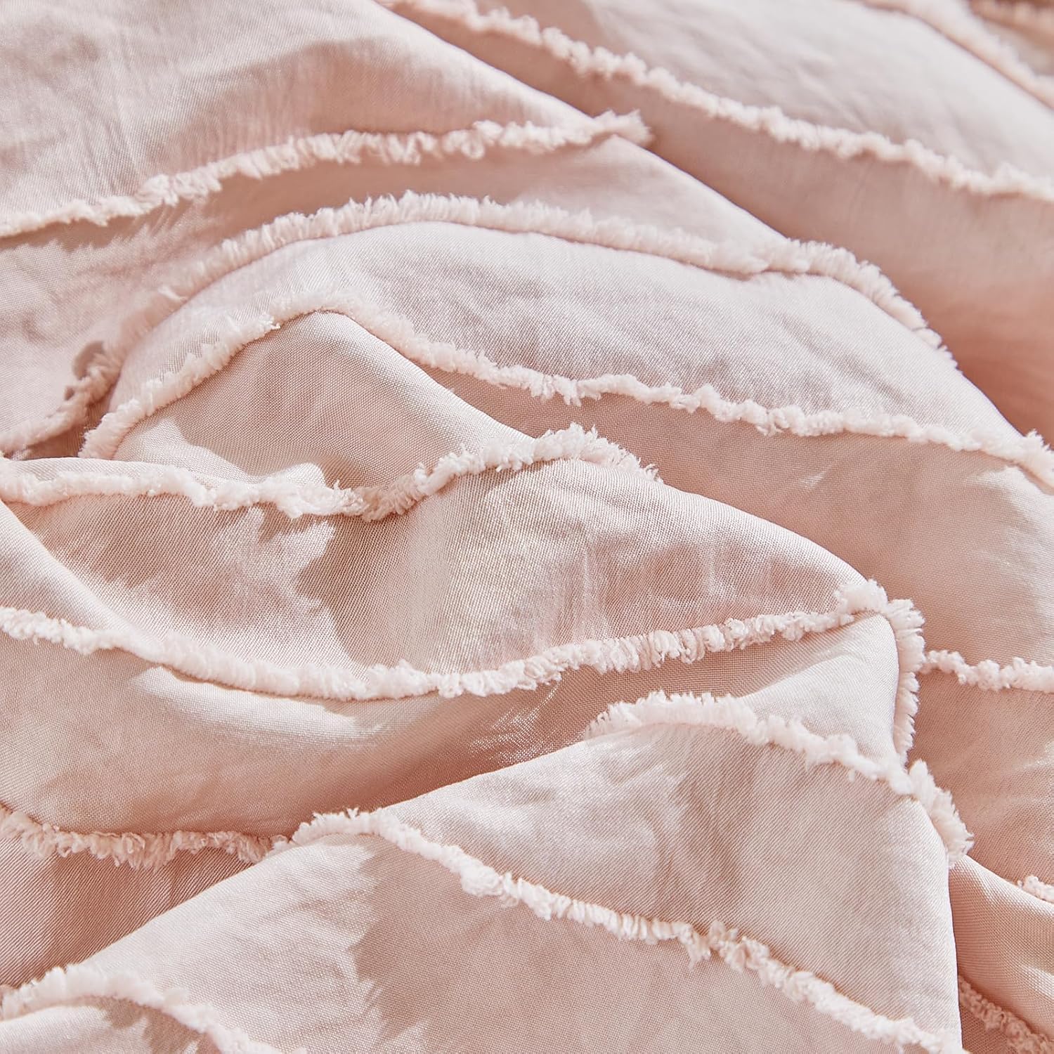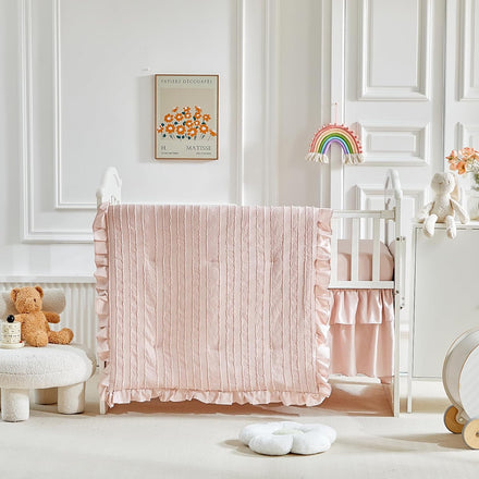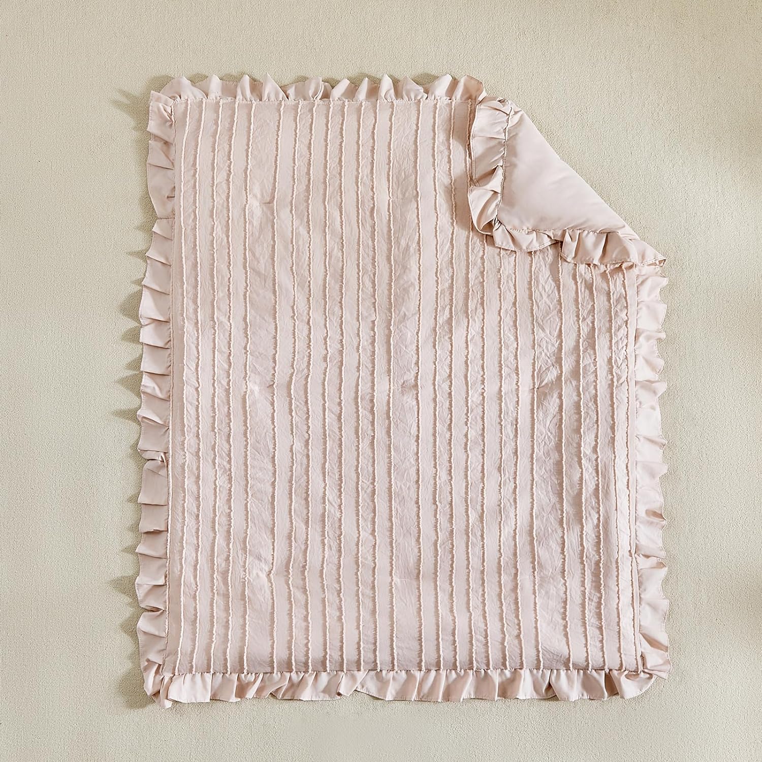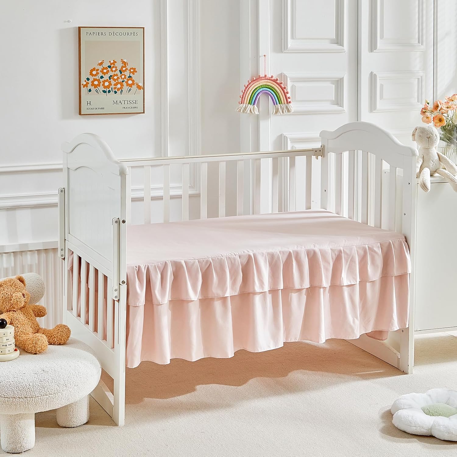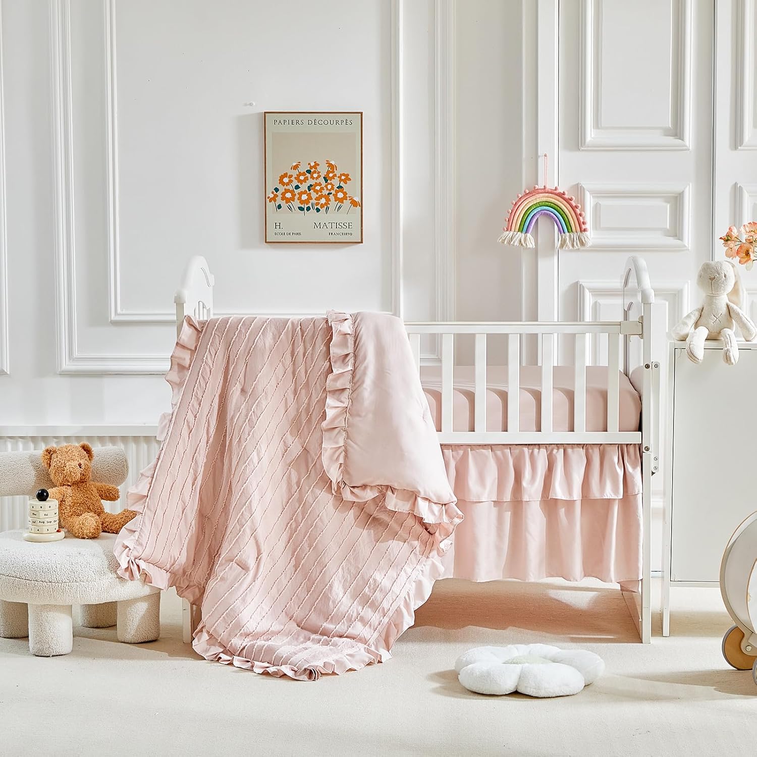 3 Pieces Tufted Stripes Crib Bedding Set with Ruffle Fringe, Pink Ruffled Comforter with Fitted Sheet and Bed Skirt, Soft and Embroidery Shabby Chic Boho Bohemian Jacquard Design for Baby Girls Boys