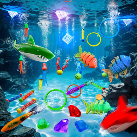 • 🌈 What’s Included: Alongside the storage bag, enjoy a variety of dive toys including diving rings, sticks, Toypedo bandits, pirate treasures, sparkling diving gems, sharks, a pair of swimming goggles, and the new magical LED light cubes.