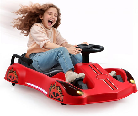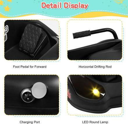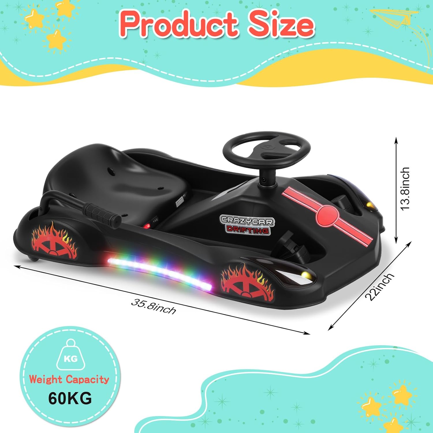 Description: 360-Degree Drift Capability: Experience thrilling rides with our electric go-kart's professional drift performance, featuring an exclusive cross-drift rod and front wheel motor for ultimate control and excitement. Three-Speed Adjustment: Adapt to different skill levels or scenarios with customizable speed settings by electric ride on toy, drifting go kart allowing riders to progress from beginner to expert at their own pace. Battery Power Display: Stay informed about your remaining power with the big wheel drifting go-kart's convenient battery indicator, ensuring you never run out of juice during your adventures. LED Lighting for Safety: Improve visibility and safety in low-light conditions with bright LED round lights, making this kid go kart electric vehicles suitable for both day and night use. Item Name: Crazy Drift Car Battery: 36V 3.6Ah Lithium Battery Motor: 250W Brushless Motor Speed: 18-21km/Hour Braking Method: Automatic Braking Front Wheel: Motor Wheel Rear Wheel: 70mm PU Wheel Charging Time 3-5 Hours Maximum Load Capacity: 60 Kilograms Features: Three Speed Adjustable, Battery Display Size Details: L: 91cm/35.83", W: 56cm/22.05", H: 35cm/13.78" (Approx.) Notes: Due to the light and screen setting difference, the item's color may be slightly different from the pictures. Please allow slight dimension difference due to different manual measurement. Package Includes: 1 x Crazy Drift Car 1 x English Manual
