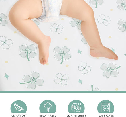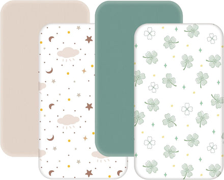 4 Pack Mini Crib Sheets Fitted - 38"x26" Pack and Play Sheets for Playard Mattress, Portable Mini Crib | Soft & Skin Friendly Pack N Play Sheets for Boys Girls (Clover & Moon Star)