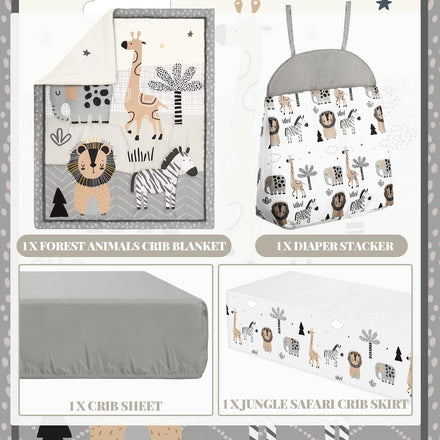 • What You Get: the 4 piece woodland animal theme crib bedding set package includes crib skirt, blanket, crib sheet and diaper stacker, a complete range to decorate a Jungle Safari style crib, convenient and practical
