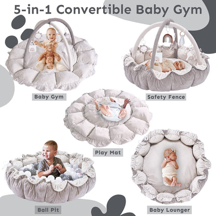 • ULTIMATE 5-IN-1 BABY GYM: Experience the perfect blend of versatility and functionality with our 5-in-1 baby play gym. This comprehensive baby activity center seamlessly transitions between a baby gym, baby nest, play mat, ball pit, and a safe play fence. As your little one grows and explores, this multifunctional gym adapts to their needs, providing a secure space for various developmental stages.