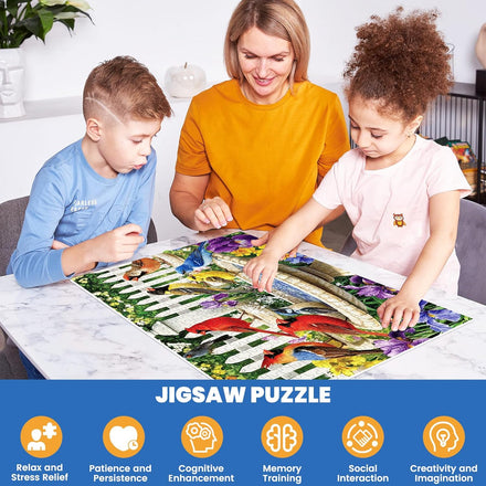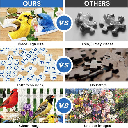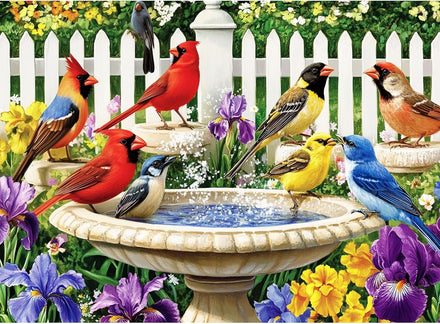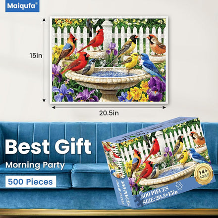 • 500-PIECE COLORFUL BIRDS - Immerse yourself in a picturesque summer scene, where vibrant birds gather around a graceful birdbath nestled amidst blossoming flowers and lush greenery. Experience the joy of putting together this captivating puzzle set.