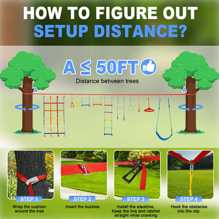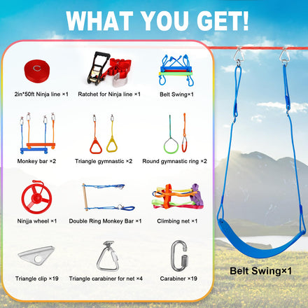 • 【Weather-proof and Safe Ninja Warrior Obstacle Course for Kids】 - Made of premium materials to withstand various weather conditions, our jungle gym is sturdy and safe: the non-slip surfaces, strong nylon webbing and sturdy steel construction to ensure worry-free playtime; Moreover, the unique buckle set ensures the quicker setup and enhanced safety without any fraying of the slackline.