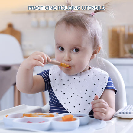 • 100% Baby-Safe Food-Grade Silicone: Crafted from 100% premium food-grade silicone, our baby self-feeding spoons are entirely safe, free from BPA, PVC, phthalates, and any toxic substances.Even when chewed, they pose no risk to children. Their baby-friendly design and heat-resistant silicone material, superior to metal or plastic, make them a popular choice for little ones.