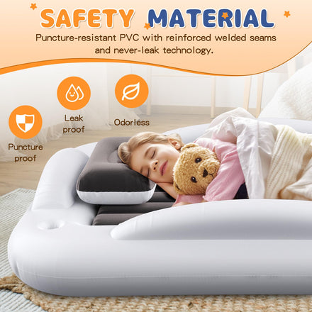 • 【PORTABLE CAMPING KIDS TRAVEL BED-DURABLE SAFETY MATERIAL】Puncture Proof and Leak-Free combines durable, puncture-resistant PVC with reinforced welded seams and never-leak technology. The complete inflatable toddler bed is designed for traveling with children, not only can release the hands of holding the child in a short time but it also for your child comfortable sleeping or playing conditions, which is a necessity for long-distance.