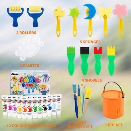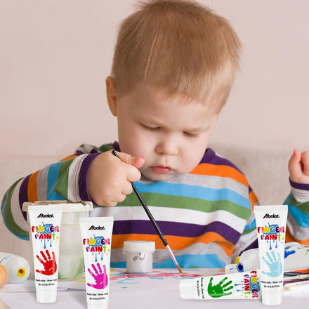 • 【Early Learning Painting Kit】ABEIER kids early learning painting kit is customized for toddlers and preschool aged kids’ early development. The painting kit with an assortment of brush shapes and paint colors will bring kids happiness, great fun and endless creativity. 12 colors finger paints can be useful to teach your kids about colors and how they can mix primary and secondary colors