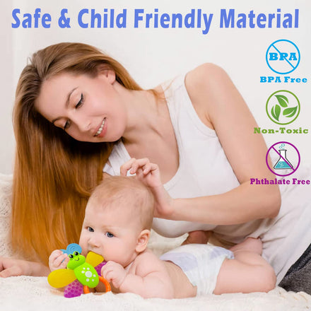 • GOOD QUALITY: BPA free. Baby rattles and teethers toy set is made of durable ABS plastic, non-toxic material. The fruit, bee, lion and butterfly teether rattle have soft teether for baby to chew on.It's safe for children to get it in mouth or chew on.