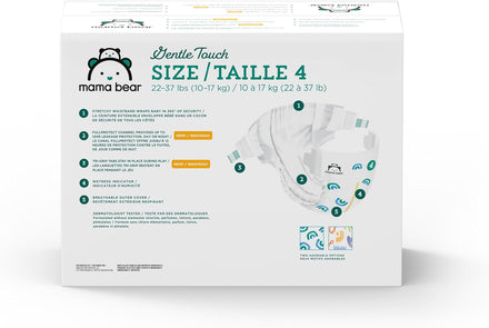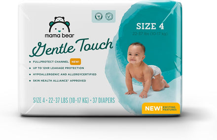 • IN THE BOX: Mama Bear Gentle Touch Diapers for babies 22–37 pounds; size 4; (4 packs of 37 diapers each, 148 total)