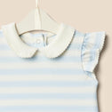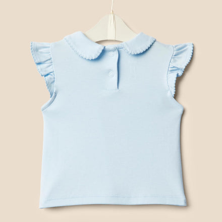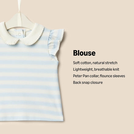 • DETAILS: Peter Pan collar, ruffle flounce sleeves, delicate embroidered edge detail, back snap closure