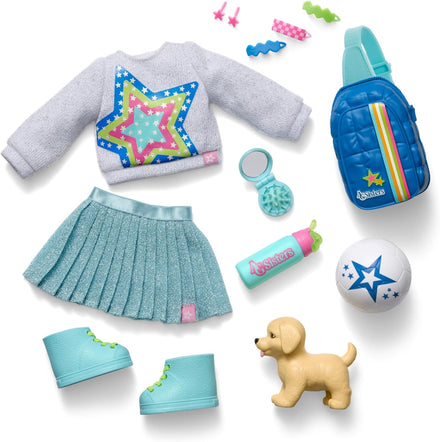 • A white glitter-knit sweatshirt with a multicolored star graphic, a glittery blue pleated skirt, and a pair of blue high-top sneakers