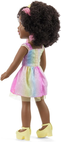 • A 14.5" Wesley doll that is sized just right for younger girls. She has brown eyes, pink heart earrings in her pierced ears, and short curly dark-brown hair with light-pink highlights.
