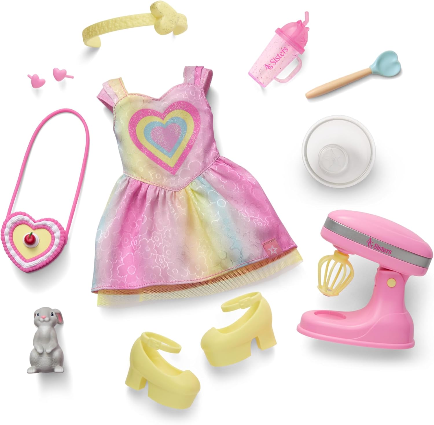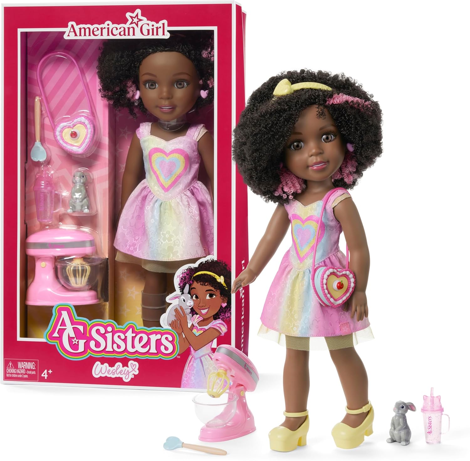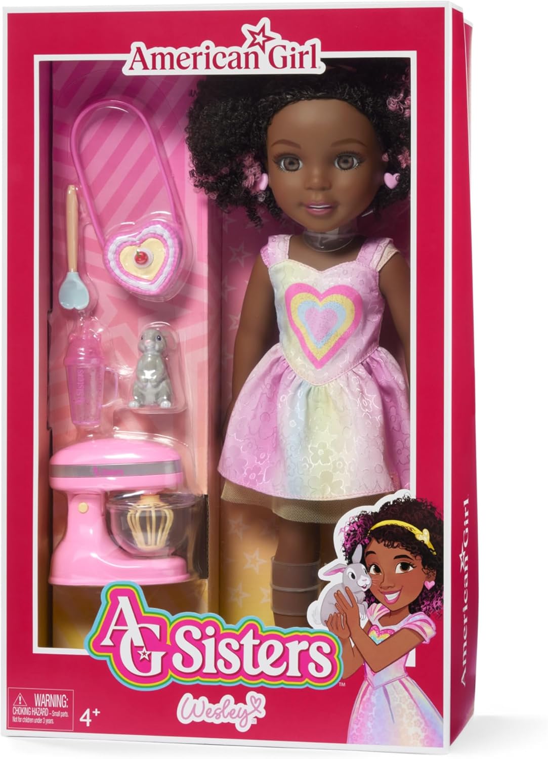Artistic and caring Wesley loves baking, creating recipes, and planning parties. When she’s not hanging out with her besties, she spends her time decorating cakes for friends and playing with her cuddly bunny. Her motto? “Life is sweet.”The Wesley 14.5" doll features brown eyes and short curly dark-brown hair with light-pink highlights. Pair this 10-piece set with the other AG Sisters dolls and their collection for playtime fun (each sold separately).