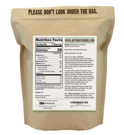 Anthony's Whole Milk Powder, 2 lb, Gluten Free, Non GMO, Made in USA