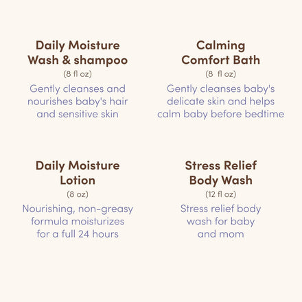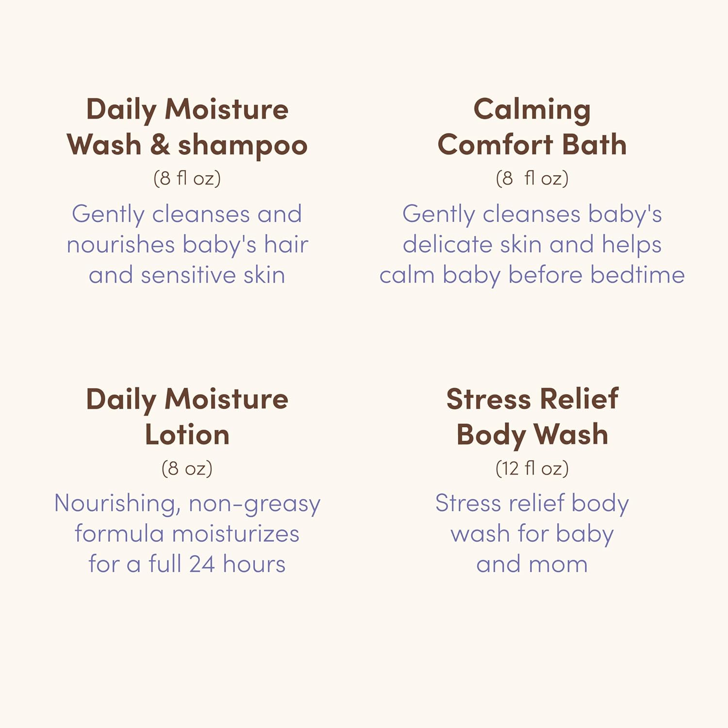 - Mommy & Me Bath Essentials: 4-piece gift set includes baby daily wash & shampoo, calming bath & wash, daily moisture baby lotion, plus a stress relief body wash for mom; reusable wicker basket for storage; Pediatrician & Dermatologist Recommended