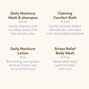 - Gentle & hypoallergenic Wash & Shampoo: soap, phthalate, and paraben-free formula gently cleanses baby’s hair and sensitive skin without drying; with natural colloidal oat; follow with Daily Moisture Lotion to help lock in hydration