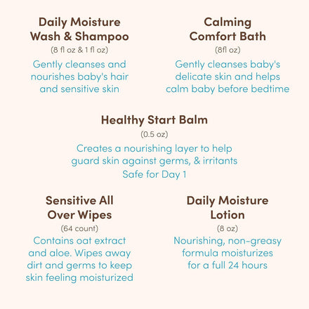 • Includes an 8-ounce tube of hypoallergenic, fragrance-free Aveeno Baby Daily Moisture lotion, formulated with nourishing prebiotic oat to nourish and moisturizes baby's sensitive skin for 24 hours, gentle enough for daily use