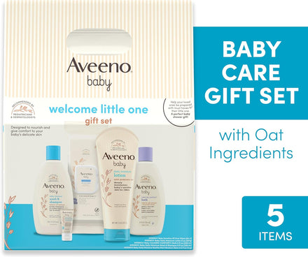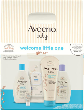 • Aveeno Baby Welcome Baby Gift Set contains 5 essential baby skincare products for baby's sensitive skin. The daily essentials giftset includes gentle products that are specially formulated to calm, cleanse, and moisturize baby's delicate skin