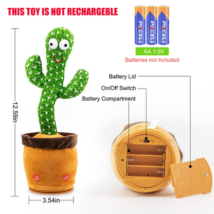 • EASY TO OPERATE - Insert 3 AA batteries(NOT INCLUDED) to get this cactus toy to talk and dance((You need to prepare 3 unchargeble AA batteries yourself). With just 2 buttons, it's super easy to use this toy. One button for “record and play", and another for playing and switching songs. Great toy for kids, friends, family as birthday gift, stocking stuffers, or party favors. Super easy and fun, suitable for all ages!