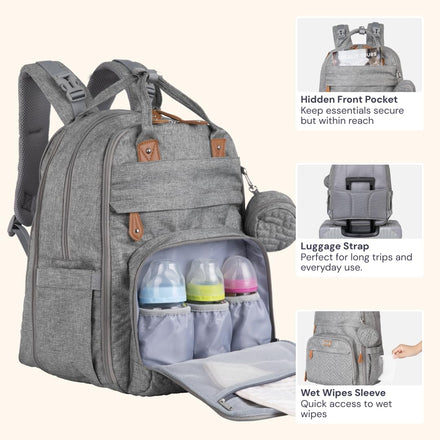 • Convenient & Thoughtful - Luggage Sleeve, easy-grab top handle, and convenient stroller clips - use this diaper bag as a travel essentials backpack, a handbag or attach to your stroller.