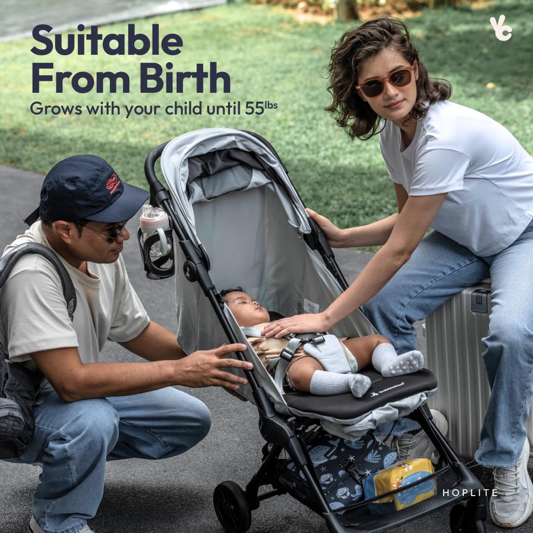 • Ready from Day One: Hoplite is the only ultralight strollers safe for newborns, featuring a 175° near-flat recline, footwall enclosure, and 5-point harness. The OEKO-TEX certified seat fabric is gentle on delicate skin and free from harmful substances. Hoplite grows with your child from their very first nap to their first big steps out in the world up to 55 lbs (48 months).