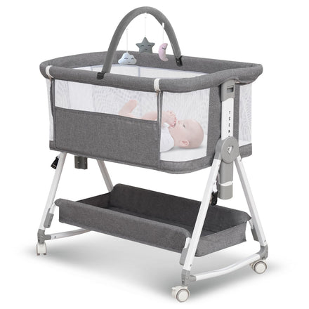 Baby Bassinet,3 in 1 Bedside Bassinet for Baby with Hanging Toys,Foldable Baby Bassinets Bedside Sleeper,4-Sided Mesh Bedside Crib with Wheels and Storage Basket,6 Height Adjustable (Light Grey)