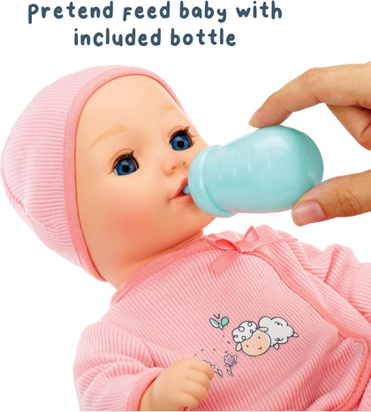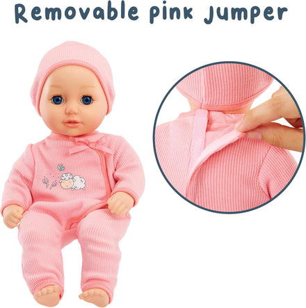 • SWEET PINK OUTFIT: She comes dressed in a removable jumper with an adorable lamb graphic on the front and a removable pink beanie.