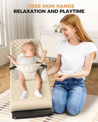 • [Portable & Foldable Design]: This baby bouncer offers two folding methods: Compact Fold – Fits easily under a sofa or table for quick storage; Ultra-Foldable Design – Can be packed into a backpack or car trunk for travel or outdoor use. Its space-saving structure makes it perfect for both home and on-the-go use.