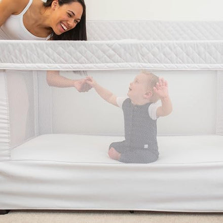 • STYLISH & COZY: Fashioned with premium quilted fabric, this crib's sleek design works perfect in any home’s aesthetic. Also, the mesh walls allow for visibility, airflow, and comfort making it the perfect resting place for your baby.