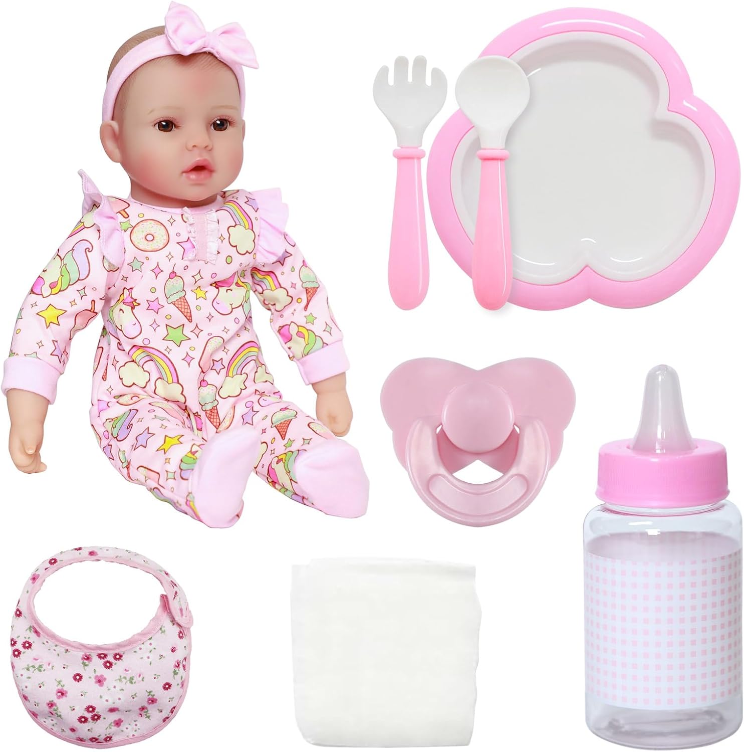 - Coming Home With - Packag & Gift: Our toy baby doll comes with an array of accessories to enhance the play experience. It includes a birth certificate, a cute outfit, a feeding bottle, a magnetic pacifier, a diaper, a bib, a fork plate, and a gift box. To keep things fresh and engaging, add layers of fun