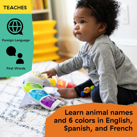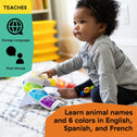 • 3 modes: Xylophone Mode helps baby create a song. Animal Mode teaches animal names and sounds. Color Mode teaches 6 color names in 3 languages – English, Spanish, and French.